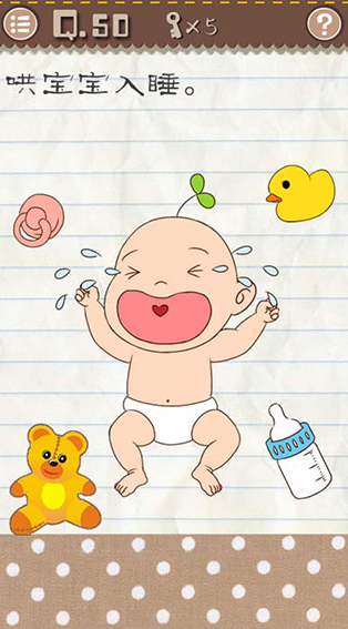 1、最囧游戏2第50关需要哄宝宝入睡,很多玩家卡在了这一关,也可以说这是最囧游戏2中难度最大最鬼畜的关卡了。最囧游戏2第50关怎么哄宝宝入睡?