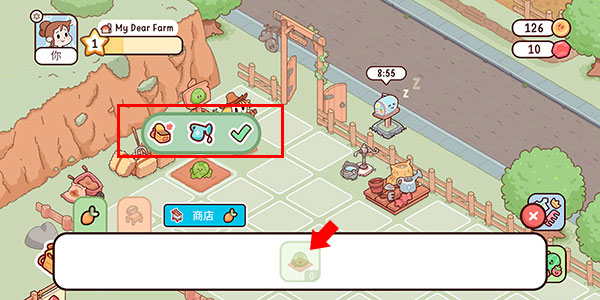 2、拖动至方格上并点击后方的勾号即可完成种植,上方功能从左到右分别是收纳至背包,浇水、确定种植
