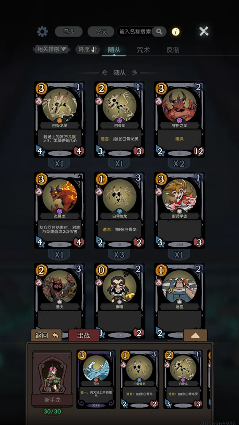 2、卡组墓地,使用过的卡依次排列在此,可长按放大查看