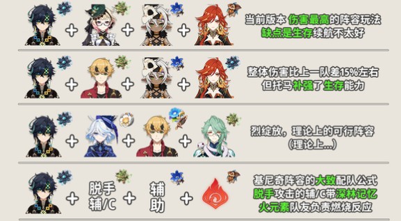 基尼奇+芙宁娜+香菱+班尼特:这套阵容伤害上限很高,芙宁娜的增伤效果显著,香菱负责触发烈绽放。不过生存压力较大,需要把握好输出节奏。