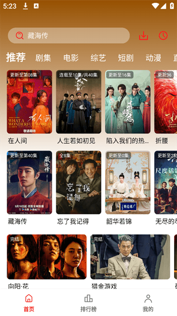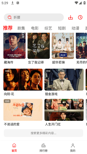 首页的顶栏将电视剧细分为电影、综艺、动画等类别,方便用户根据喜好快速定位。通过榜单功能,对影视剧进行人气排序,将当前热门影视剧呈现给用户,帮助用户快速找到人气高的作品。