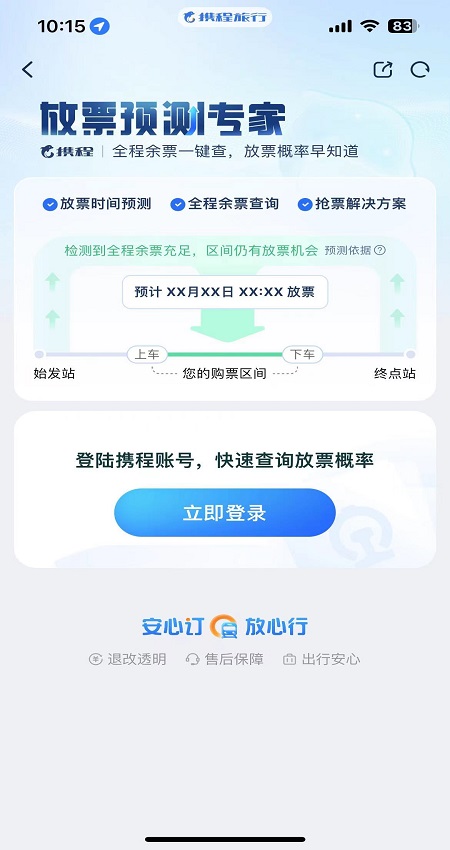 放票预测神器app是一款超好玩的火车票查询软件,能帮助用户在没抢到票时查询列车是否还有余票,还可让用户知晓候补票能否补到,它具备精准的放票预测功能,为出行者提供实时、准确的票务信息,助力轻松规划行程,避免因票务问题耽误出行安排,是出行查询火车票的实用工具。