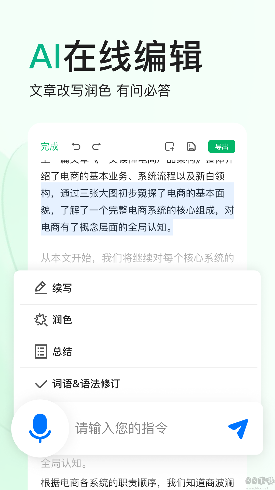 2. 辅助润色美化文案,支持一键扩写、续写或改写内容;格式排版,查找替换,功能一应俱全;