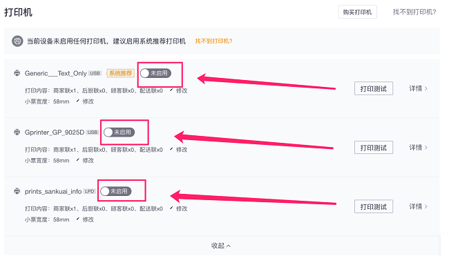 5、最后一步,确保能打印出测试小票的打印机处于“已启用”状态、不能打印的打印机处于“未启用”状态(通常情况下,如果您只有一台打印机,请确保只有一台打印机处于“已启用”状态)