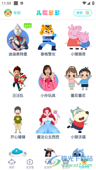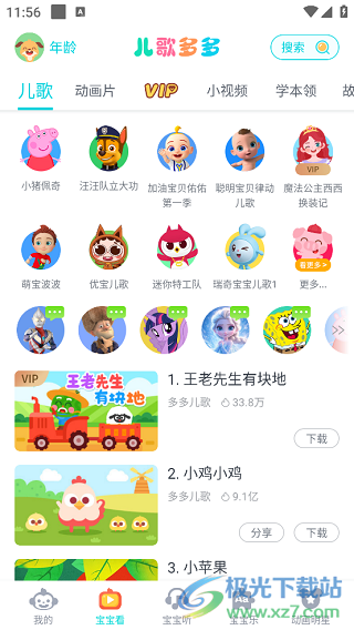 1、首先需要打开手机中的儿歌多多精简版,来到“宝宝看”界面中,拥有大量的儿歌、动画片等视频资源。