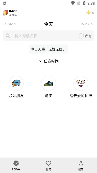 2、今天要坚持的习惯会单独呈现在 TODAY 页面中,轻轻一点图片即表示完成该习惯的打卡;