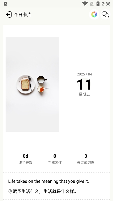 3、每天都会推送一张卡片,当今天所有习惯都完成之后即可获得该卡片,并收藏起来。您可以在卡片的背面记录该日的感想,激励自己;