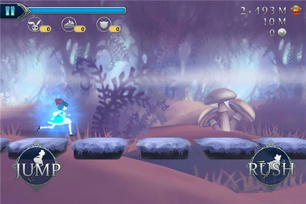 魔法道具系统:地图中散布多种魔法道具,变大蘑菇可让爱丽丝暂时无敌并撞碎障碍,时间沙漏能减缓奔跑速度,飞鞋可实现长距离跳跃,合理使用道具能轻松突破难关,增加跑酷乐趣。