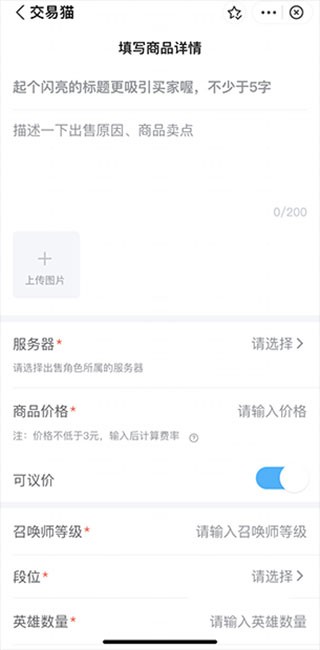3、填写详细信息。商品的图片、标题、出售原因、服务器、售价、基础参数、账号绑定、战力指数、游戏角色等级等细节都要填写。买家通过账号细节,快速掌握信息,从而轻松促成交易。交易猫为卖家提供曝光量,给买家提供咨询。