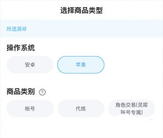 2、商品发布。选择商品的基本信息,玩家们填写操作系统、商品类别,比如游戏币、代练、道具、账号、交易方式等。